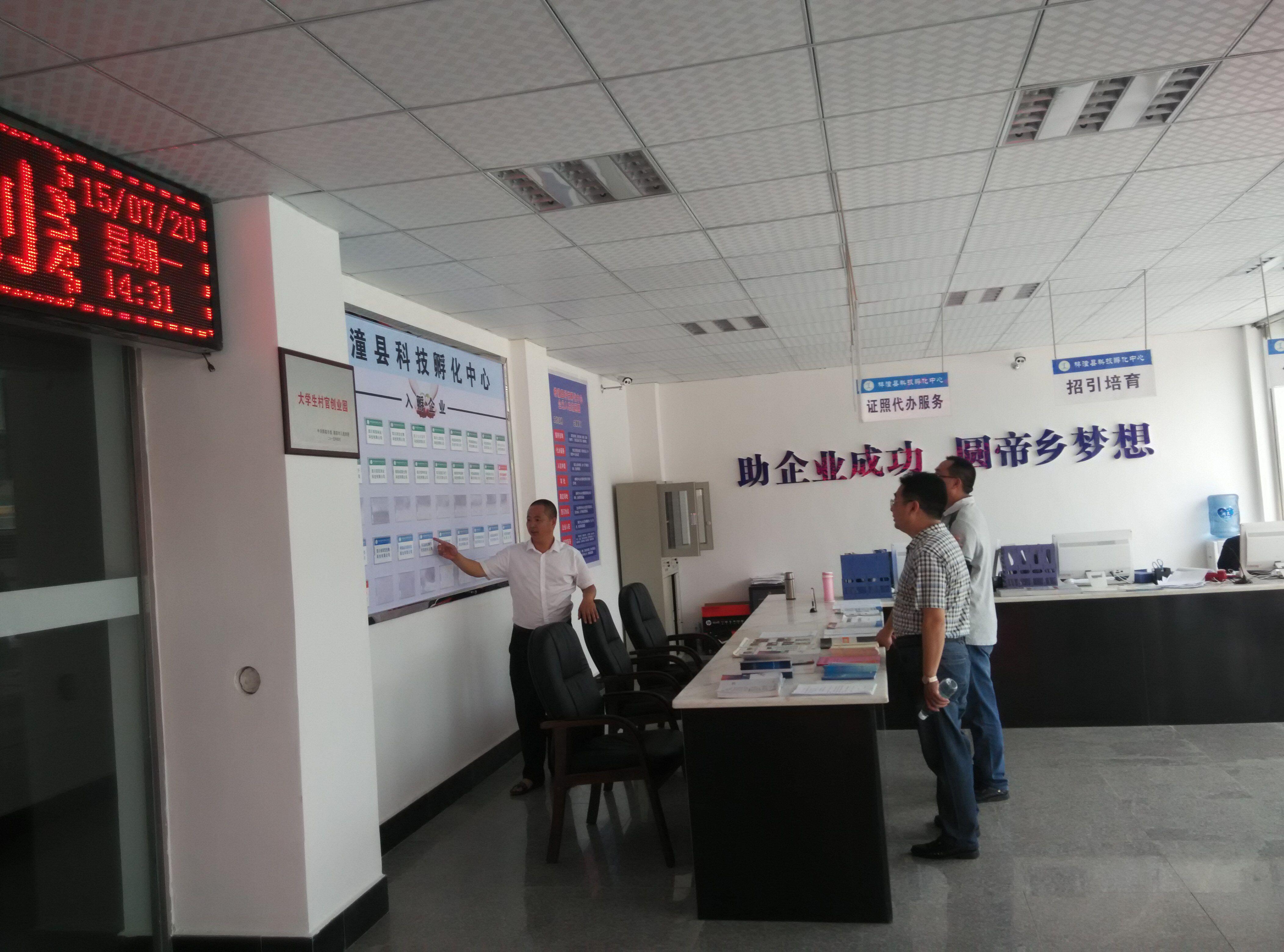 2015年7月20日14點(diǎn),梓潼人社局魏永國(guó)局長(zhǎng)、趙正華主任蒞臨梓潼科技孵化中心考察調(diào)研,孵化中心楊旭靜經(jīng)理全程接待陪同,詳細(xì)講解科技孵化中心運(yùn)作情況。