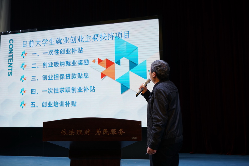 縣人社局、縣科工商務局、縣總工會、團縣委、縣經(jīng)開區(qū)等相關(guān)部門做創(chuàng)新創(chuàng)業(yè)扶持政策宣講。